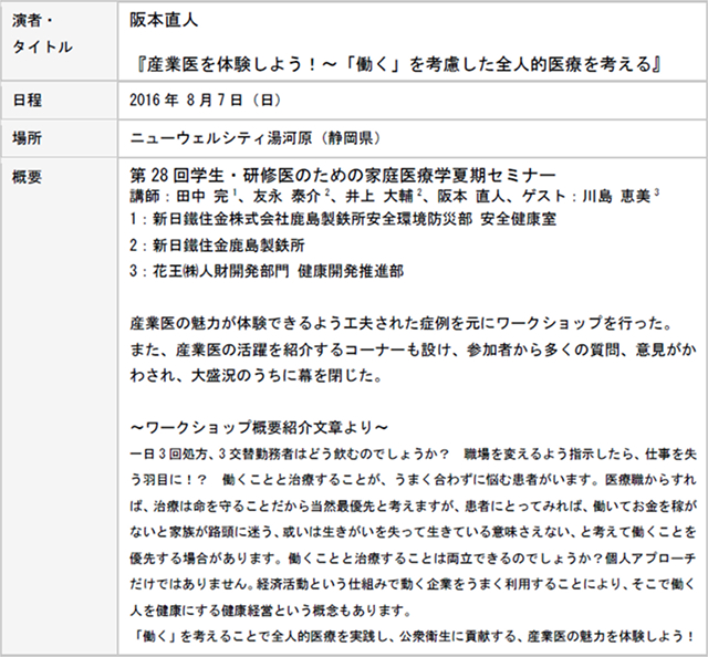 - 大学の授業では知ることが出来なかった産業医の役割,守備範囲の広さ,産業保健の重要性を知ることができ,興味が湧いた。