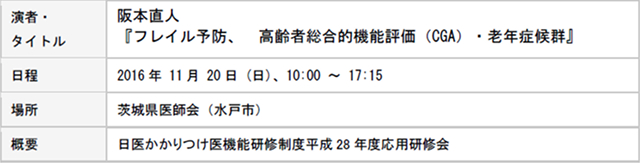 2016年度は、引き続き阪本医師による月曜・火曜の診療に加え,筑波大学総合診療科から非常勤として、水曜・木曜の総合診療科医師1名の派遣を継続し,月曜から木曜までの診療をカバーした。さらに,筑波大学総合診療科から1名の総合診療科常勤医(病棟・救急・在宅診療業務を含む)の派遣も継続し、合計3名での診療を担当した。